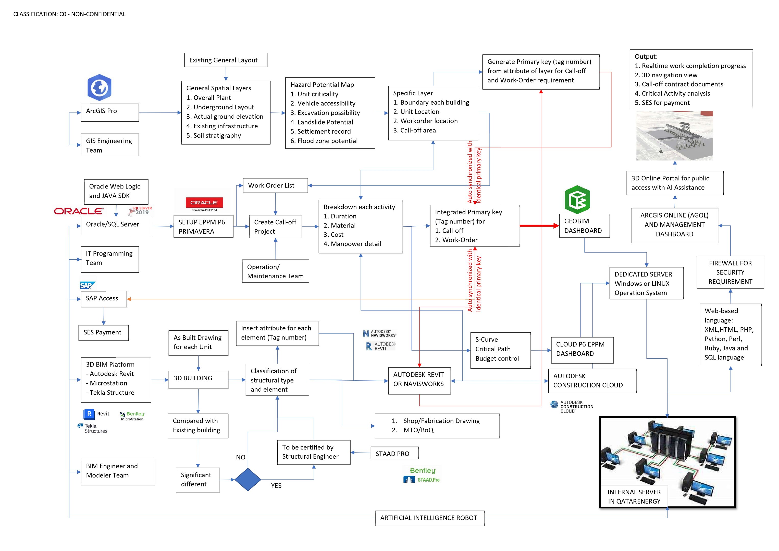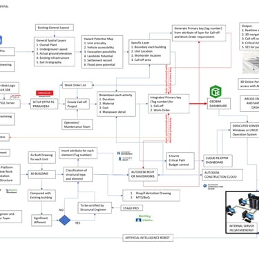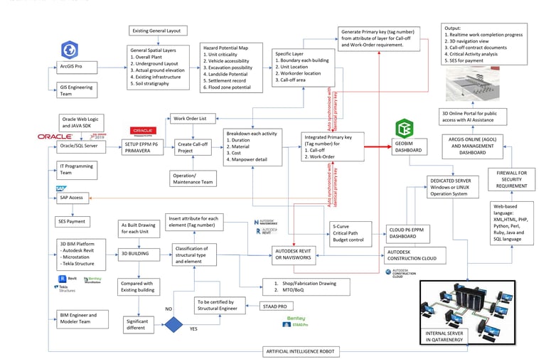 Cloud Oracle Primavera Project Management supported by Oracle Business Intelligence Enterprise are the main machines to store all metadata from 3D-BIM and GIS software . All these metadata will be developed by SQL Query and python language to generate dashboard or management report in order to identify budget forecast, project progress, risk control, financial report, timesheet and more report options.
